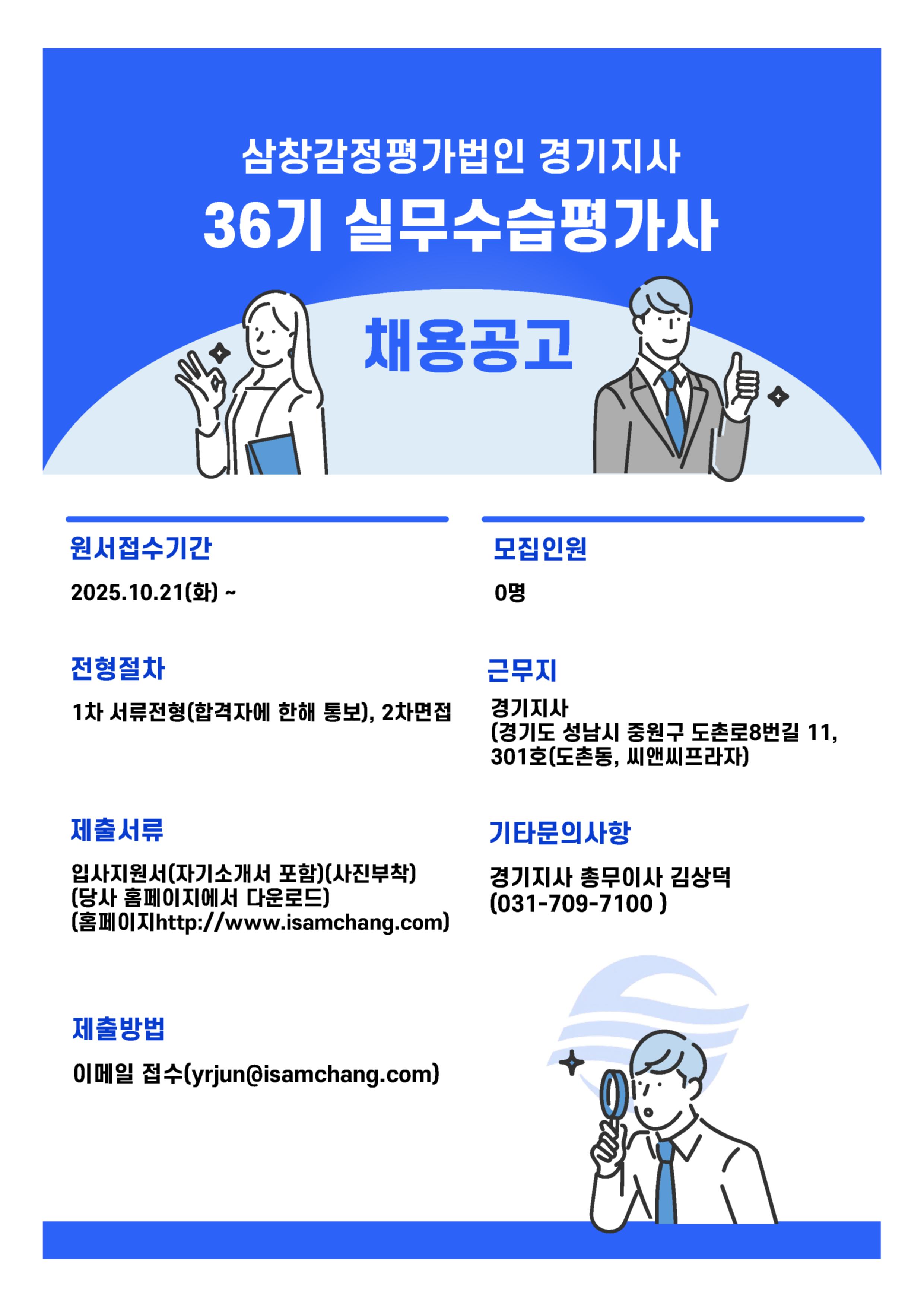 ㈜삼창감정평가법인 경기지사는 능력있고 패기있는 분들을 모시고자 아래와 같이 공고하오니 많은 지원을 바랍니다.