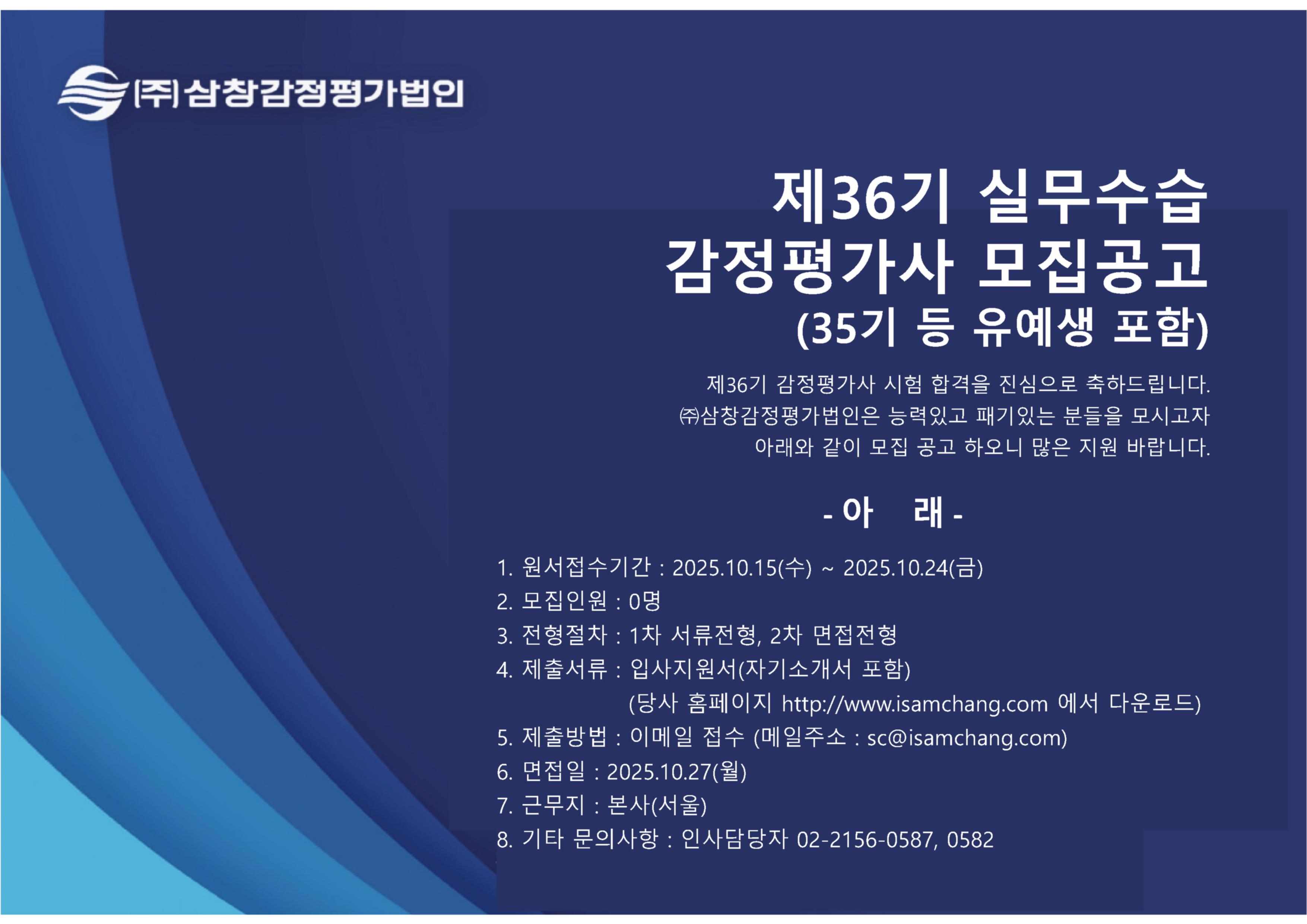 ㈜삼창감정평가법인은 능력있고 패기있는 분들을 모시고자 아래와 같이 모집 공고 하오니 많은 지원을 바랍니다.